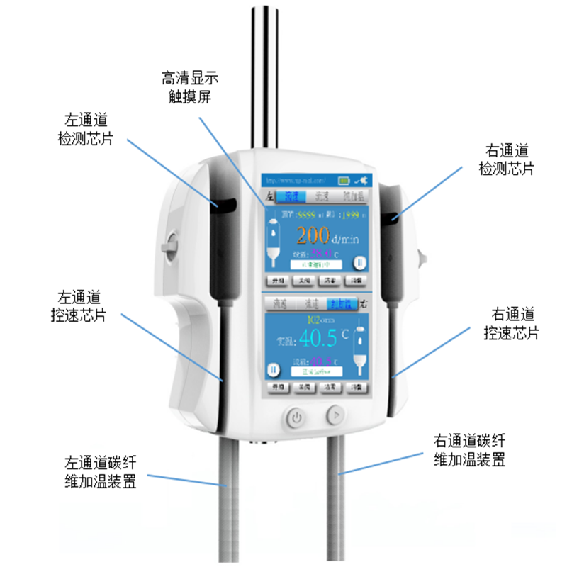 3、智能微電腦控制三腔碳纖維加溫條 2 分鐘內(nèi)快速升至設(shè)定溫度,加溫條長(zhǎng)度高達(dá) 1.2 米,與各種型號(hào)輸注管路適配,同時(shí)保證流出液體的溫度恒定,三重升溫保護(hù)機(jī)制,全方位保障輸注安全。