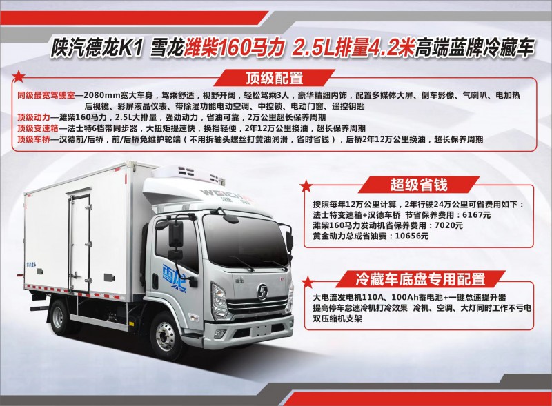 法士特8檔變速箱(帶原廠同步器),漢德免維護車橋(50萬公里免維護,變速箱車橋2年或12萬公里間隔保養),中控鎖,電動門窗,遙控鑰匙,2.5/6T前后橋,7.00R16鋼絲胎,中控液晶顯示儀表盤,多媒體大屏,倒車影像,發動機自帶原廠雙支架,電動空調(帶除濕功能),全包裹座椅內飾,多功能方向盤,定速巡航,日間行車燈,一鍵尋車,雙USB接口,彎道輔助照明,導流罩,顏色冰川銀